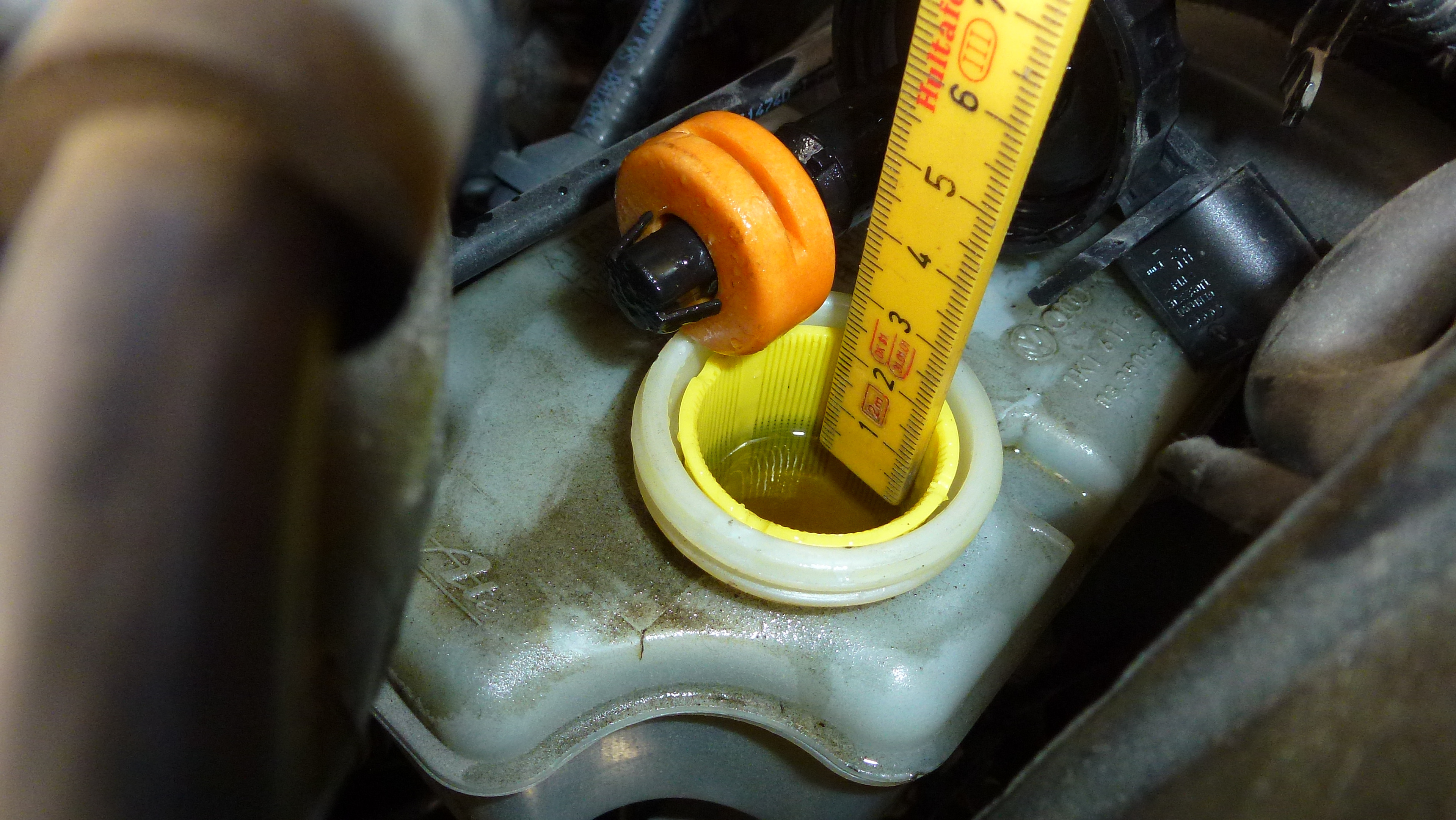 Bromsvätskebehållaren med den gula färgen på locket. Den sitter väldigt krångligt placerad med tanke på att man vill kunna avläsa vätskenivån.